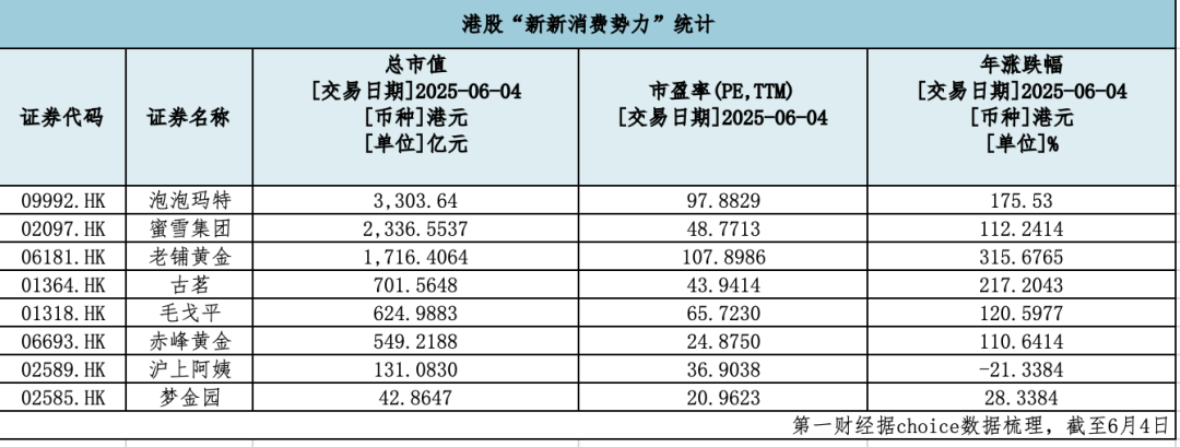 前一个交易日,老铺黄金、蜜雪集团、泡泡玛特股价一度续创历史新高。截至当日收盘,蜜雪集团股价报收615.5港元,市值为2337亿港元,年内上涨112.24%;泡泡玛特报收246港元,市值为3304亿港元,年内上涨175.53%;老铺黄金报收994港元,市值为1716亿港元,年内上涨315%。